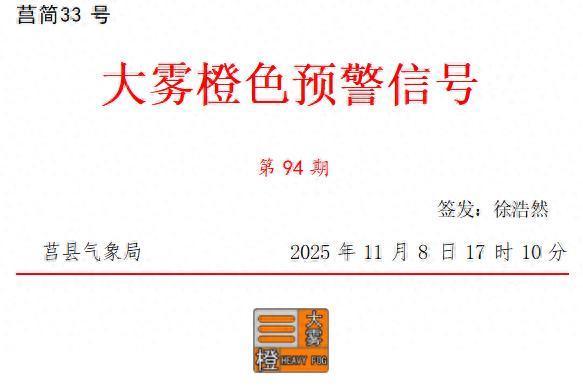 莒县气象台2025年11月8日17时10分发布大雾橙色预警信号:预计今天夜间到明天上午,莒县大部分镇街将出现能见度低于200米的雾,局部能见度不足50米。请注意防范!
